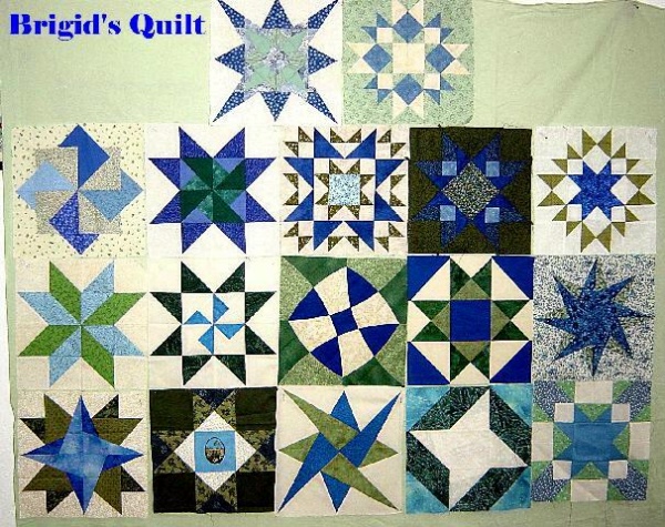 20th January 2002 10th February 2002 3rd March 2002 24th March 2002 14th April 2002 5th May 2002 26th May 2002 16th June 2002 7th July 2002 28th July 2002 8th August 2002 8th September 2002 29th September 2002 20th October 2002 10th November 2002 1st December 2002 12th January 2003 2nd February 2003 23rd February 2003 | Brigid Brigid asked for star blocks using sagey greens, china blues and calico creams. A number of us were uncertain about whether our blocks were really what she wanted, as this was quite an unusual colour combination, but the blocks all go very well together and the finished quilt is stunning. proposed layout for Brigid's blocks the finished quilt, hanging at Hever, Sept 2003 |