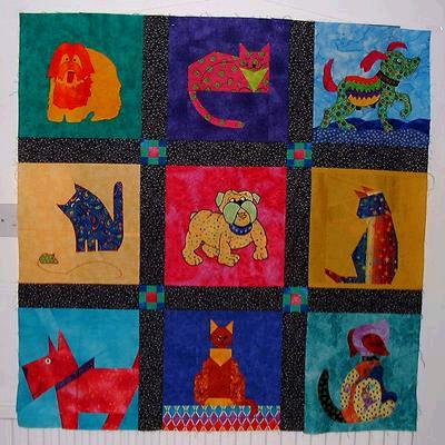 20th January 2002 10th February 2002 3rd March 2002 24th March 2002 14th April 2002 5th May 2002 26th May 2002 16th June 2002 7th July 2002 28th July 2002 8th August 2002 8th September 2002 29th September 2002 20th October 2002 10th November 2002 1st December 2002 12th January 2003 2nd February 2003 23rd February 2003 | Meg Meg requested cat or dog blocks, using a plain (unpatterned, though textured ok) background colour, and very bright and funky colours for the dogs and cats themselves. She hopes to make 2 comfort quilts for her kids to snuggle under when they aren't feeling quite the thing, so she wanted a really cheery mix of animals. Meg with first quilt, finished, at Hever |